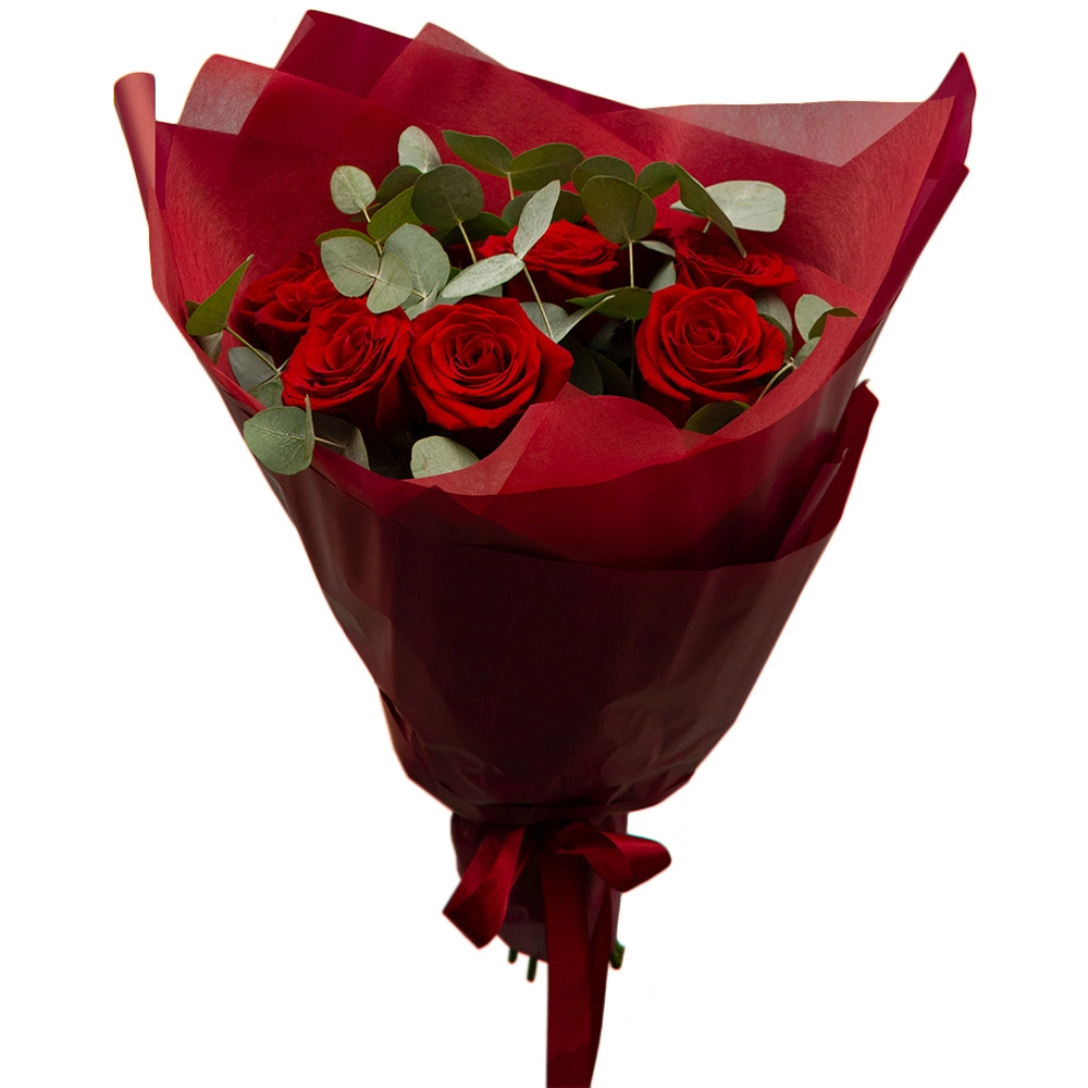 Букет из 9 красных роз с эвкалиптом – классика любви и нежности