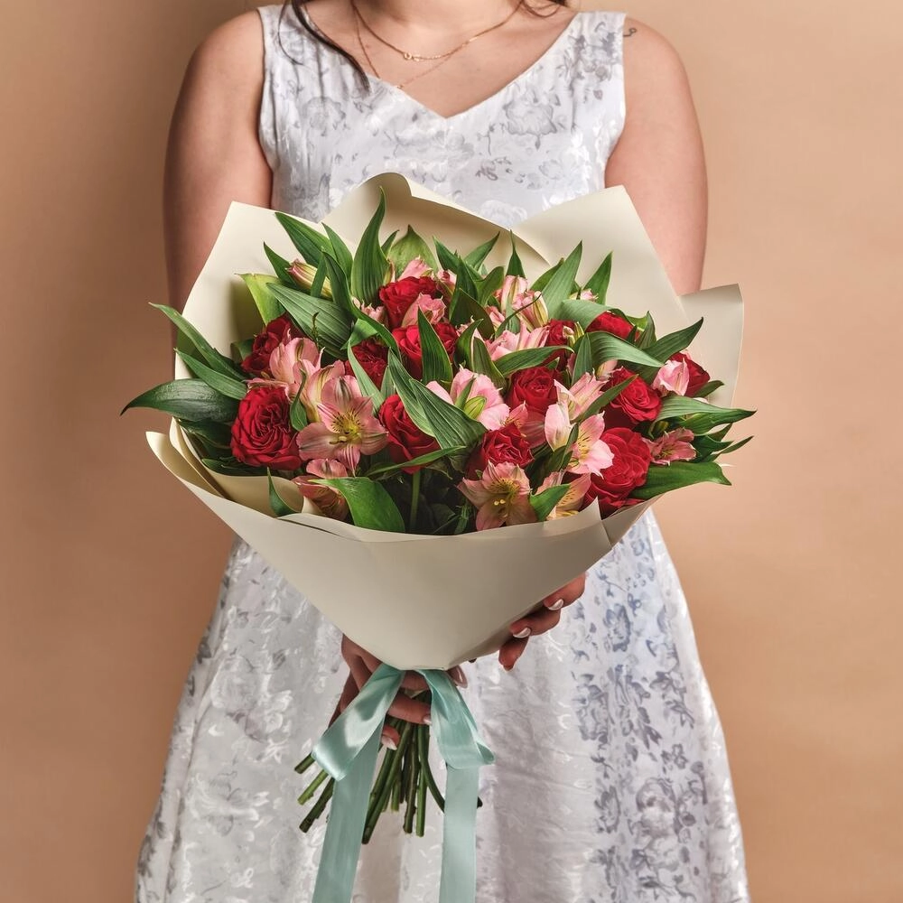 Букет «Нежность слов» — гармония красных роз и нежных альстромерий