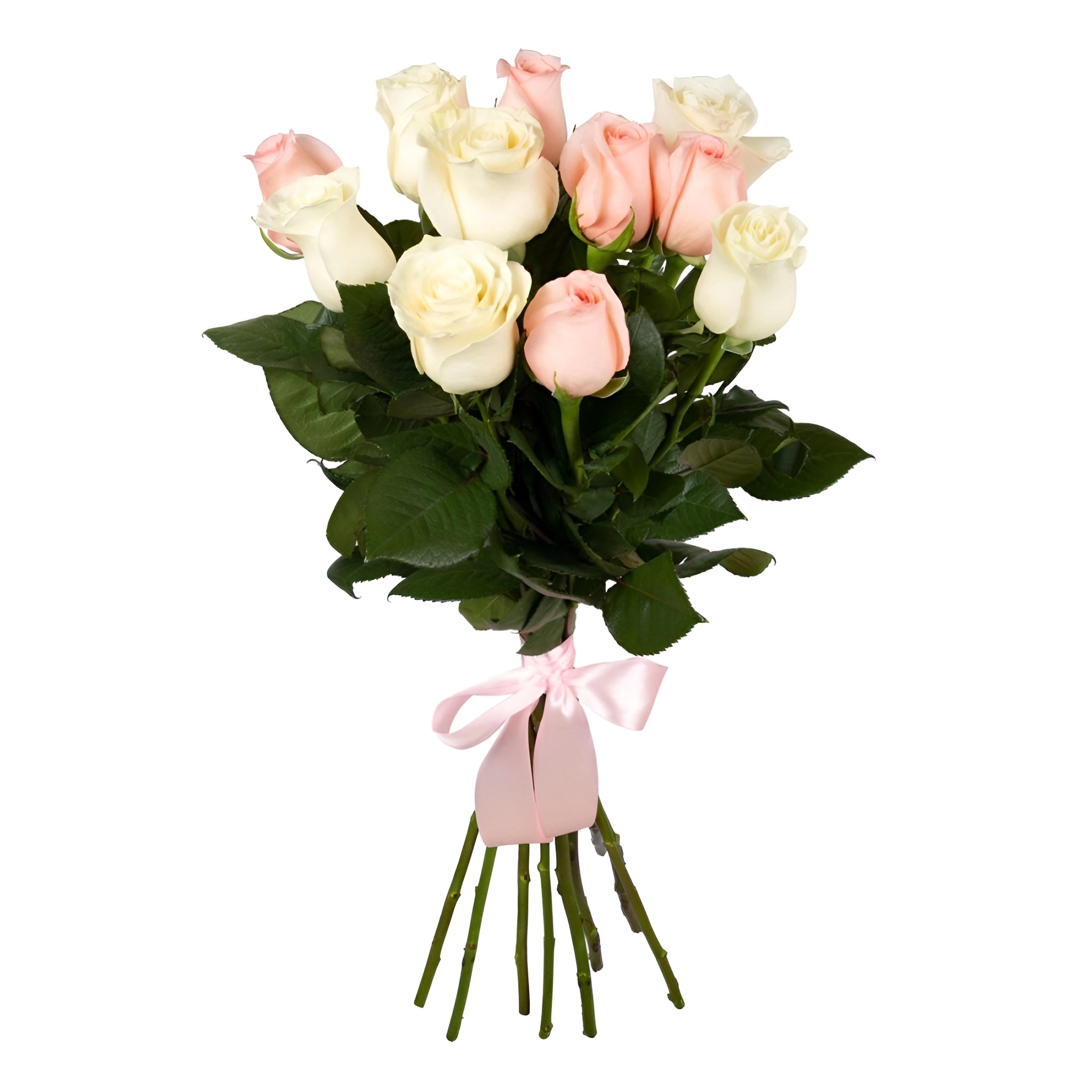 Очаровательный букет, сочетающий розовые и белые розы, воплощает нежность и элегантность.