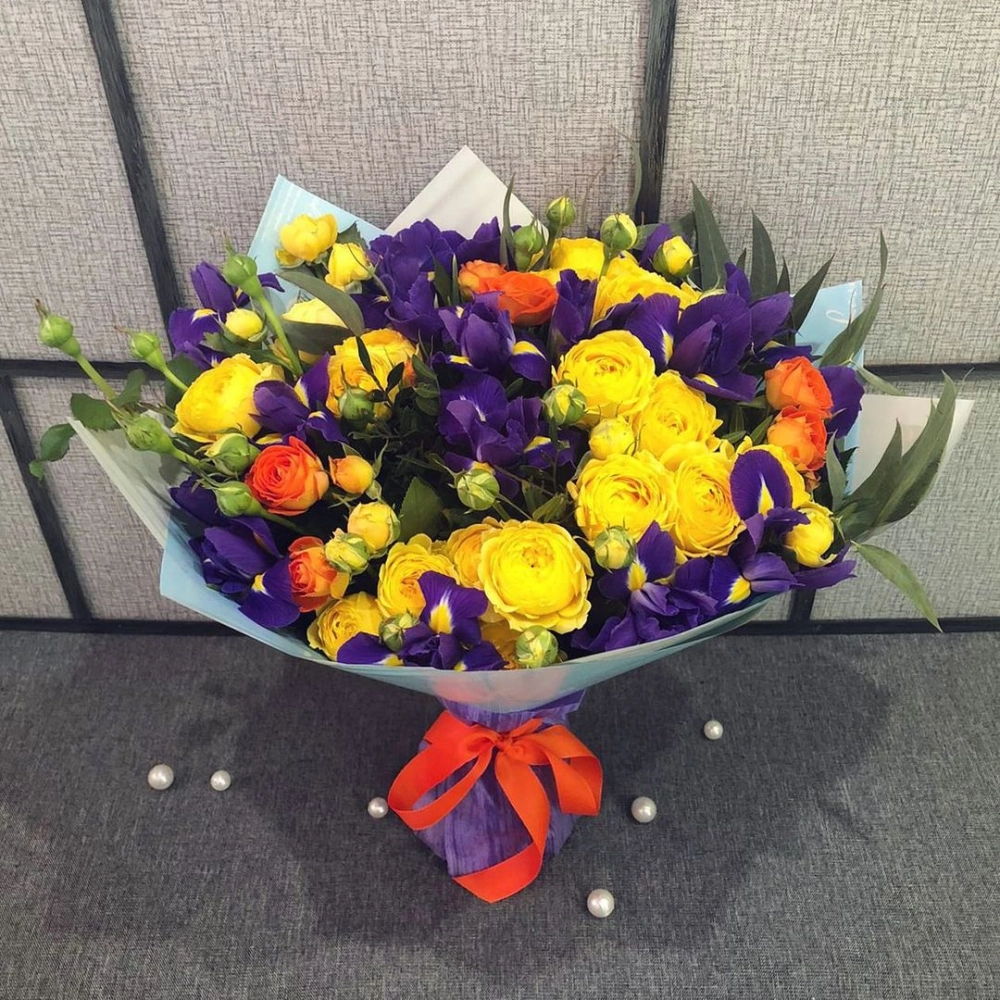 Роскошный букет из синих ирисов и кустовых роз с зеленью – гармония контрастов