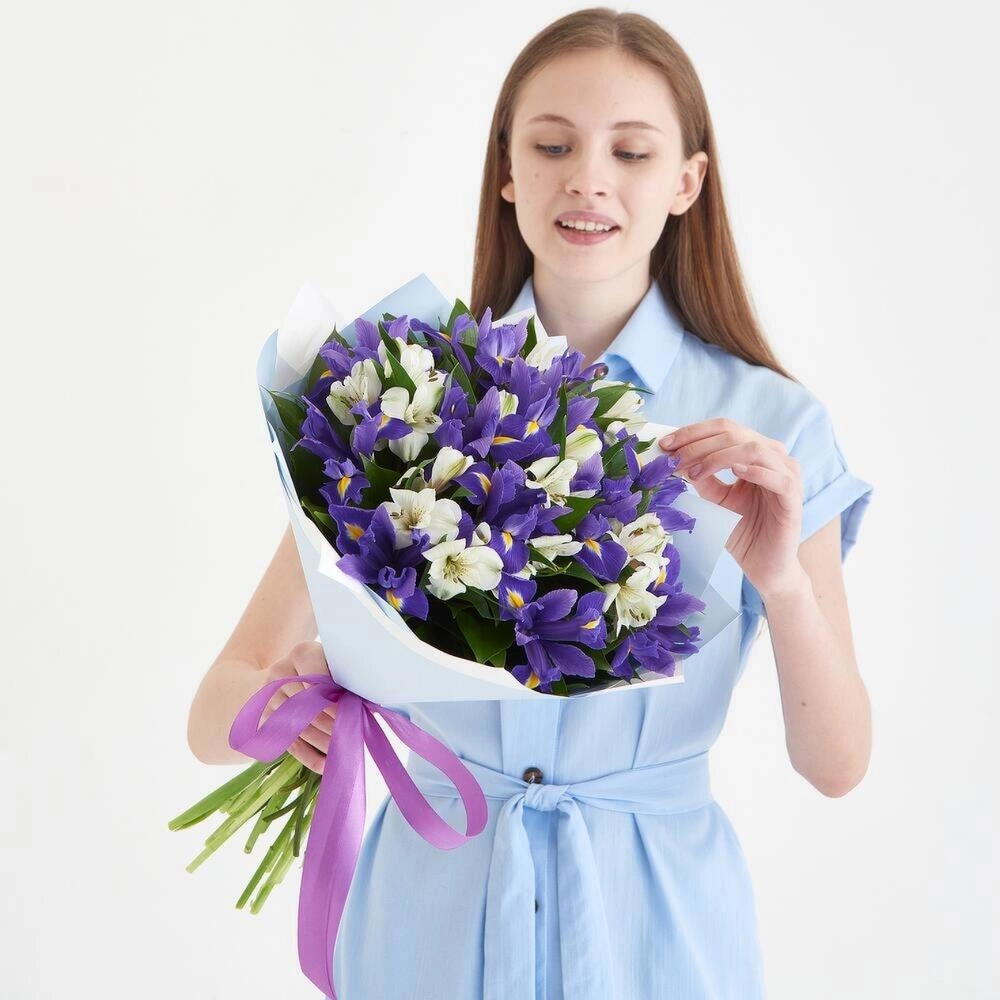 Утончённая композиция из синих ирисов и белых альстромерий создаёт атмосферу таинственности и нежности.