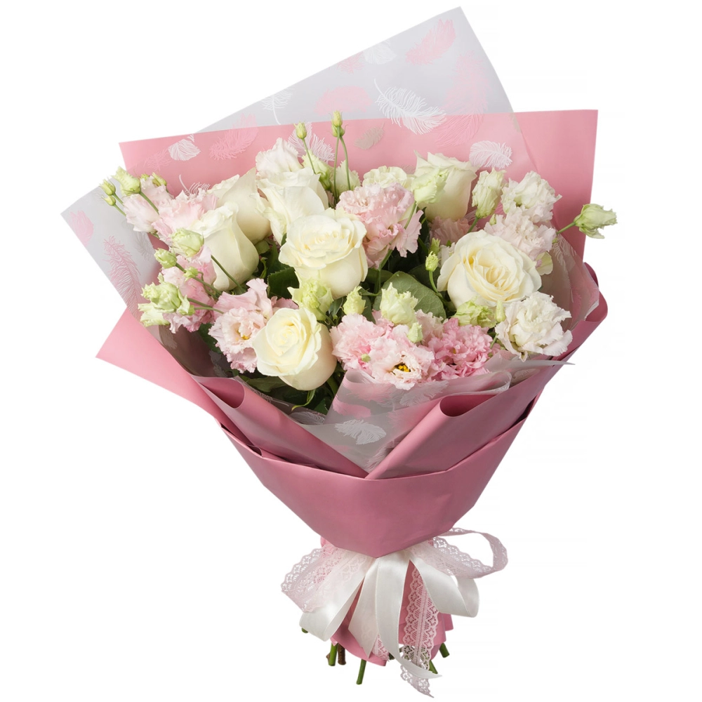 Трогательный букет «Объятия любимой» сочетает хрупкие розовые эустомы и благородные белые розы. Идеальный романтический подарок для особых моментов. Букет цветов с доставкой Астрахань.