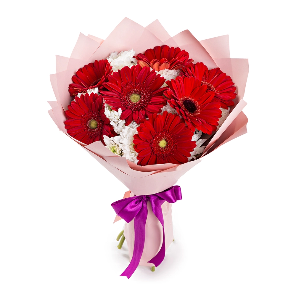 Яркая композиция из 7 сочных гербер и 4 белоснежных хризантем – идеальное сочетание энергии и нежности. Заказать цветы с доставкой на дом Астрахань.