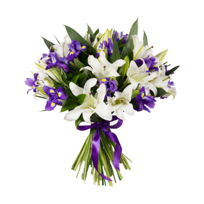Изысканный букет сочетает благородные белые лилии и небесно-голубые ирисы.