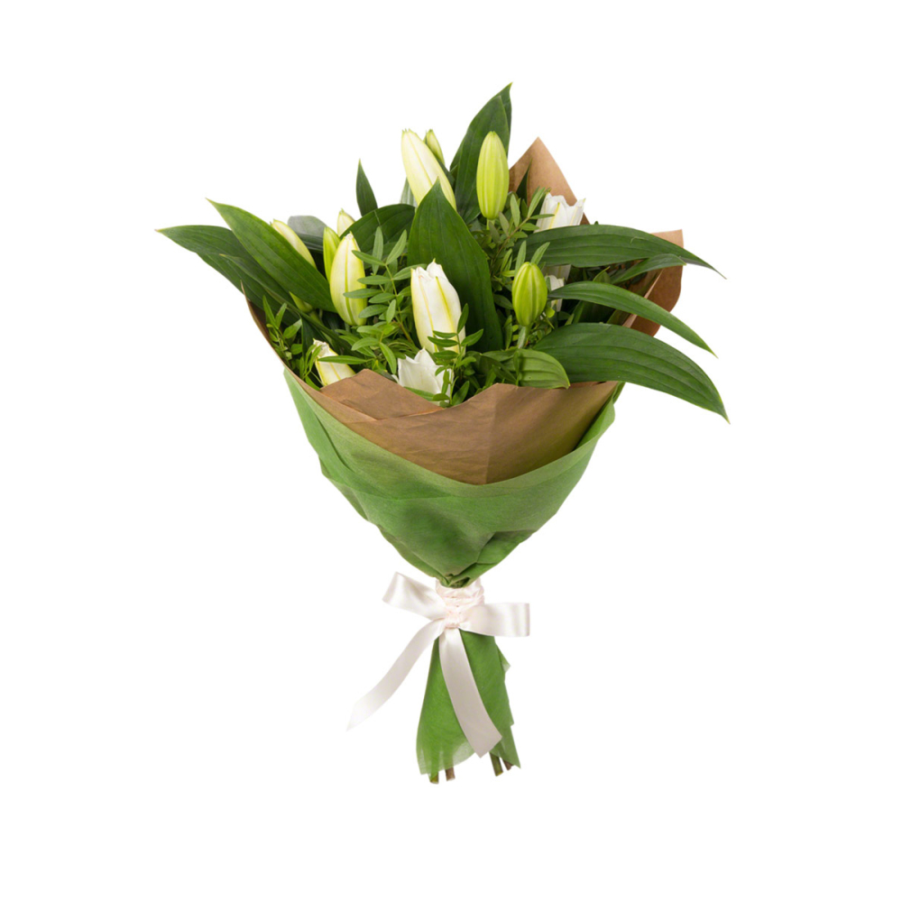Утонченный букет из белых лилий с нежной фисташковой зеленью — воплощение свежести и изысканности.